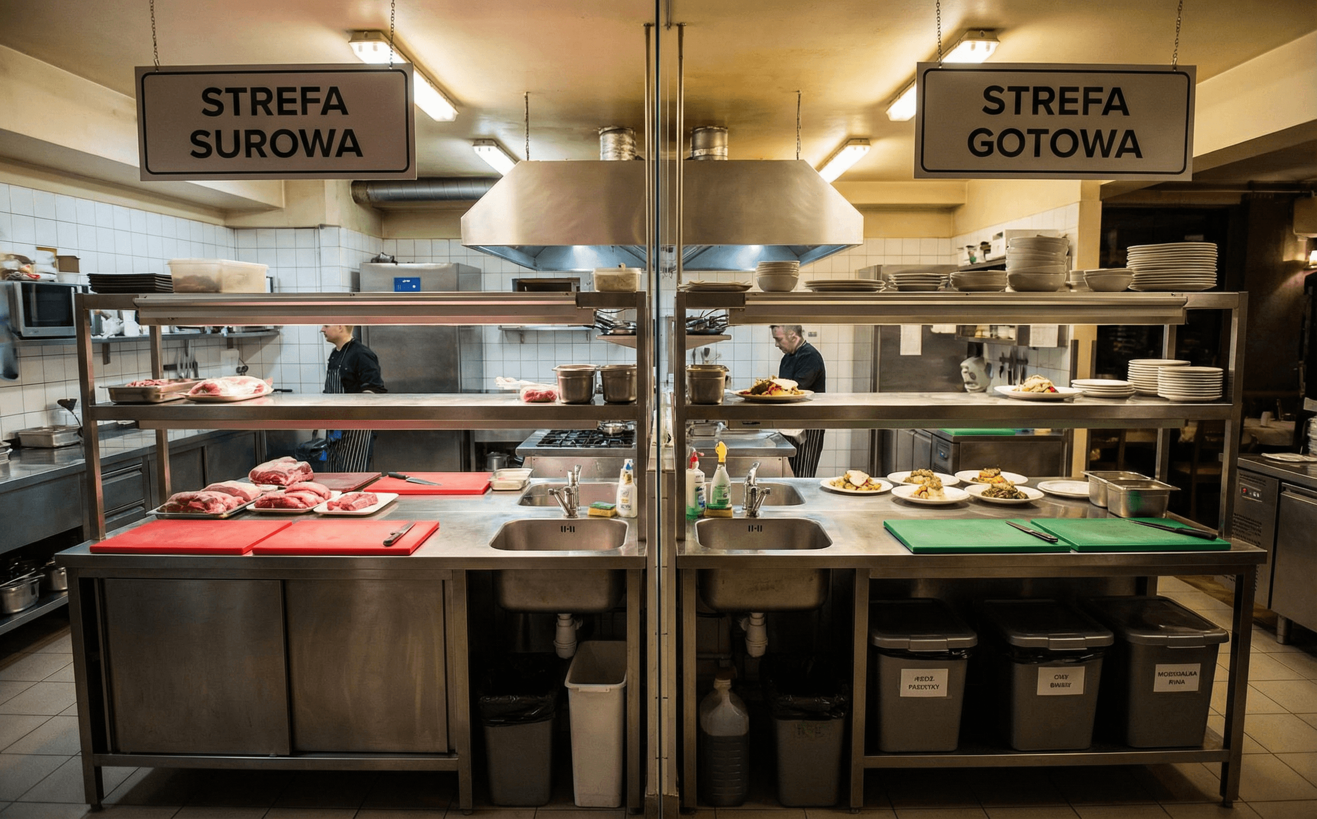 Podział na strefy czyste / brudne oraz zasady ruchu personelu i produktów, żeby ograniczyć zakażenia krzyżowe.